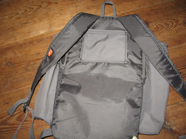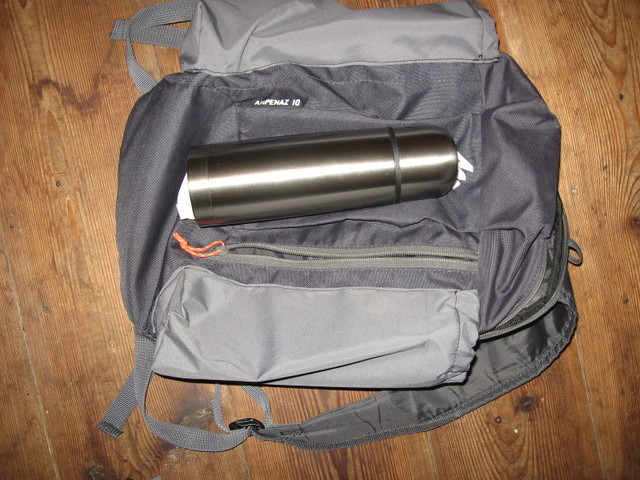 stwierdziła moja matula, kupiwszy sobie ładny, acz niezbyt pojemny plecak Quechua Arpenaz 10. Mieścił się strój na basen, kanapki, ale już na napoje nie było miejsca. I po bilet trzeba głęboko sięgać. Niewiele myśląc, z resztek szarej kordury po tatowej torbie uszyłem dwie kieszenie boczne - na termosik i butelkę - oraz kieszeń na bilet. Ta ostatnia ma pięciokrotnie zwinięty brzeg, z którego zrobiła się fajna kedra. Bilet nie wyleci. Kieszenie na napoje mają wszyte gumki, nieco zwężające wlot i utrudniające wysunięcie pojemnika.