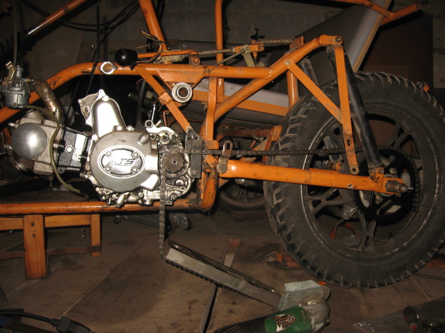 Do wyboru był silnik z Hondy CUB (podróba) lub Hondy CG125 (też podróba). Drugi jednak okazał się za duży. Szkoda, bo ma 5 biegów i 100W alternator. Wybór padł na 50-kę (no dobra, 70-kę) z CUB-a. Ma poziomy cylinder, więc nie trzeba było przerabiać rury nad silnikiem. Jedynej cześci konstrukcji, dzięki której DUo nie skłąda się w pół pod ciężarem kierowcy. Silnik CUB waży 19 a nie 34 kilogramy (jak CG) a to jeszcze ważniejsze niż owa rura, którą dało by się przebudować. Generator ciągu w DUO jest umieszczony na lewo od trójkąta utworzonego między punktami styku kół z podłożem. Każdy kilogram umieszczony poza tym trójkątem, szczególnie umieszczony niesymetrycznie, zwiększa podatność pojazdu na wywrotkę. 15 kilo to naprawdę dużo.