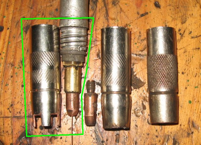 W zielonym obrysie zestaw do punktowego spawania blach (zamiast zgrzewania), standardowa końcówka prądowa, standardowa łuska prądowa i łuska skrócona do spawania w zakamarkach.