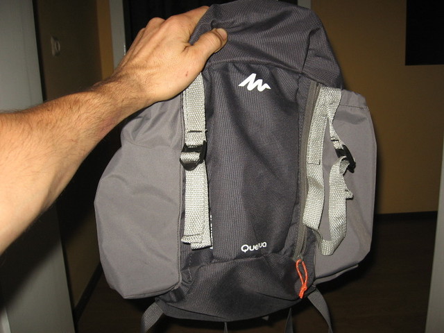 stwierdziła moja matula, kupiwszy sobie ładny, acz niezbyt pojemny plecak Quechua Arpenaz 10. Mieścił się strój na basen, kanapki, ale już na napoje nie było miejsca. I po bilet trzeba głęboko sięgać. Niewiele myśląc, z resztek szarej kordury po tatowej torbie uszyłem dwie kieszenie boczne - na termosik i butelkę - oraz kieszeń na bilet. Ta ostatnia ma pięciokrotnie zwinięty brzeg, z którego zrobiła się fajna kedra. Bilet nie wyleci. Kieszenie na napoje mają wszyte gumki, nieco zwężające wlot i utrudniające wysunięcie pojemnika.