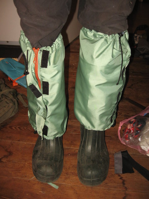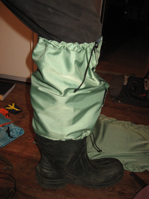 Nie ma w sprzedaży takich, które ogarną kalosze. Nie są mi potrzebne taśmy pod piętę, jakie występują w normalnych stuptutach. Miałem resztki stylonu i jeden zamek. I najważniejsze - lubię czasem szyć chociaż nie umiem. Wystarczyło dokupić drugi zamek i stopery gumek, wyciągnąć z pudełka z „długimi rzeczami” rzep z odzysku, gumkę. Ponieważ stuptuty na kalosze spokojnie można zakładać bez rozpinania (na nogę, potem kalosz), zamki i rzepy nie muszą być YKK i Velcro. Wystarczą zamki marki „zamek” i rzepy marki „rzep”. Zamka używa się bardzo rzadko, np. jeśli trzeba zdjąć bardzo ubłocone obuwie i stuptuty nie brudząc skarpet.