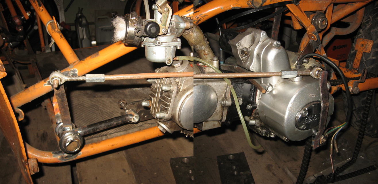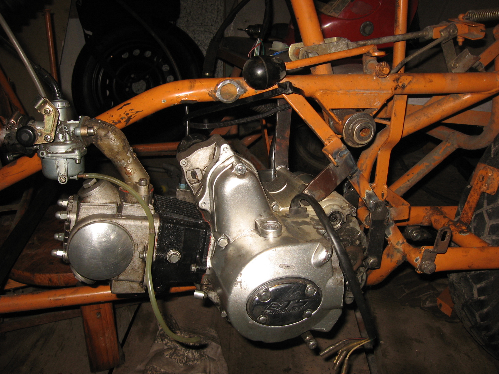 Do wyboru był silnik z Hondy CUB (podróba) lub Hondy CG125 (też podróba). Drugi jednak okazał się za duży. Szkoda, bo ma 5 biegów i 100W alternator. Wybór padł na 50-kę (no dobra, 70-kę) z CUB-a. Ma poziomy cylinder, więc nie trzeba było przerabiać rury nad silnikiem. Jedynej cześci konstrukcji, dzięki której DUo nie skłąda się w pół pod ciężarem kierowcy. Silnik CUB waży 19 a nie 34 kilogramy (jak CG) a to jeszcze ważniejsze niż owa rura, którą dało by się przebudować. Generator ciągu w DUO jest umieszczony na lewo od trójkąta utworzonego między punktami styku kół z podłożem. Każdy kilogram umieszczony poza tym trójkątem, szczególnie umieszczony niesymetrycznie, zwiększa podatność pojazdu na wywrotkę. 15 kilo to naprawdę dużo.