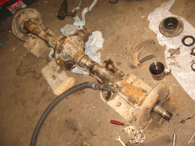 Problemem pozostawały tylne hamulce. Ich siłowniki wymagają ogromnej ilości płynu hamulcowego pod jako-takim ciśnieniem. Pompa nadająca się do tarczowych, podaje nie za dużo płynu ale pod sporym ciśnieniem. Hamulce UAZ-a robiłbyby przy takim zasilaniu przez parę kilometrów od regulacji. Wykombinowałem więc sposób jak przerobić je pod siłowniki z Golfa i samoregulatory z Opla. Kupa rzeźby, efekt średni a koszt zbliża się do wymiany na tarczówki. A że pod tarcze na przód i tak trzeba było kupić felgi z Samuraia, bo w uazowych kołach tarcz nie upchasz, doszedłem do wniosku - nie dziaduj, rób cztery tarcze.
