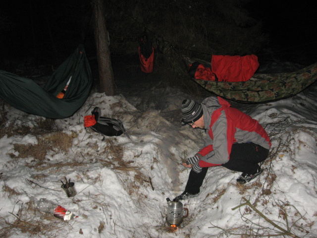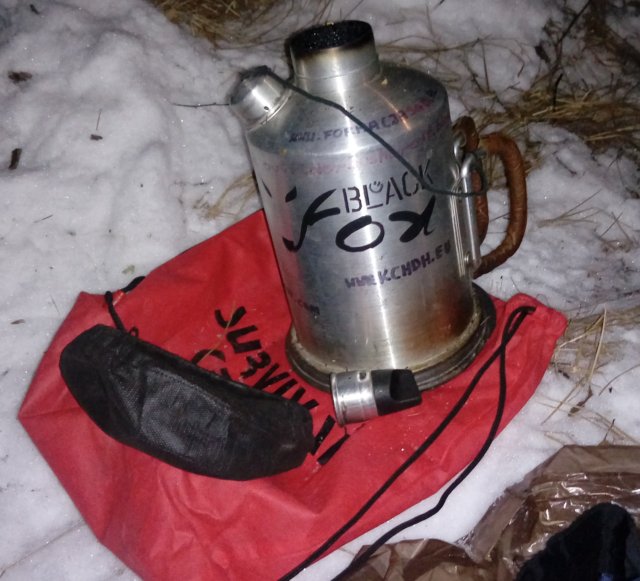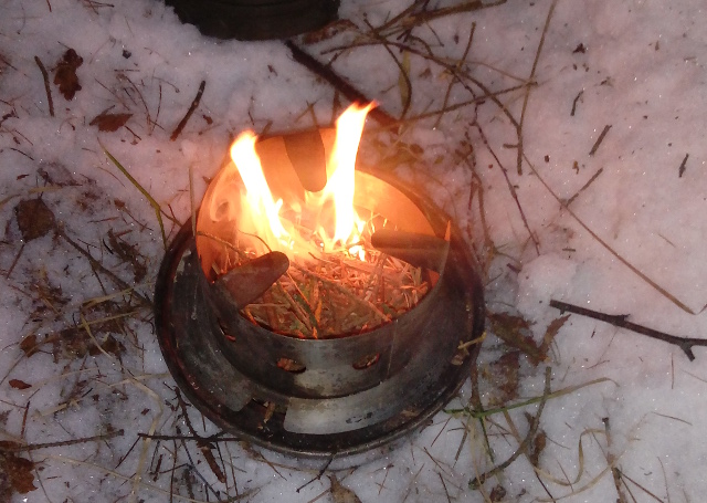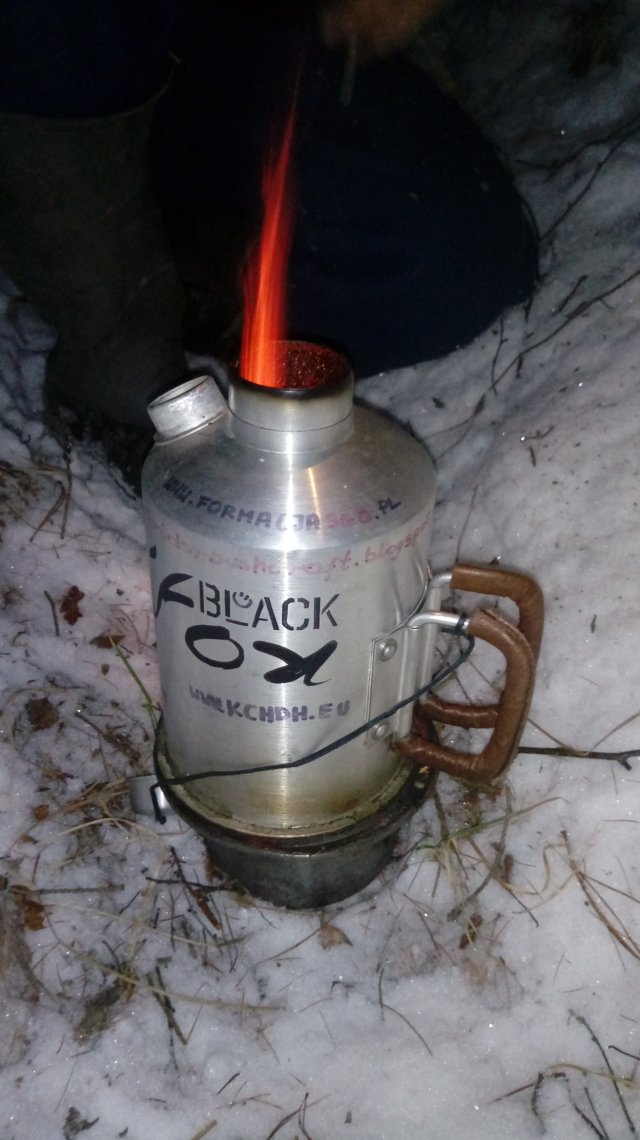 Na zagotowanie litra wody przy -6 stopniach Celsjusza, zużyliśmy „garść” patyczków wielkości samego czajnika. Spokojnie da się na takim ładunku jednocześnie odgrzać jakieś jedzenie, ale dokładanie zużywającego się błyskawicznie opału wymaga wprawy, przytrzymywania, zdejmowania. Mimo to - fajny patent.