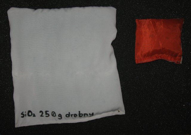 Dwutlenek krzemu, krzemionka, silikat, silikażel, magiczna substancja z drogich pocłaniaczy, to powszechnie używane, znane nam granulki. Minerał o ogromnej powierzchni wewnętrznych porów, zdolny do wchłonięcia wody w ilości nawet 37% własnej masy. Dla naszych pochłaniaczy przyjmijmy 25%, potem ilość wchłanianej w czasie wilgoci spada. Silikażel można „regenerować” przez wysuszenie, w temperaturze do 120 stopni Celsjusza, jednak w warunkach domowych cieżko go utrzymać w tej temperaturze, jednocześnie nie dopuszczając do rozsadzenia wewnętrznych porów przez parę. Bezpiecznie można suszyć granulki na kaloryferze. Producenci pochłaniaczy proponują też kuchenkę mikrofalową, orientacyjnie 5 min. 600W dla porcji 350g, ale tu również łatwo przesadzić. Niektórzy producenci „wkładów” z SiO2 w ogóle nie wspominają o możliwości ich suszenia i ponownego użycia, najwyżej o wyrzuceniu.